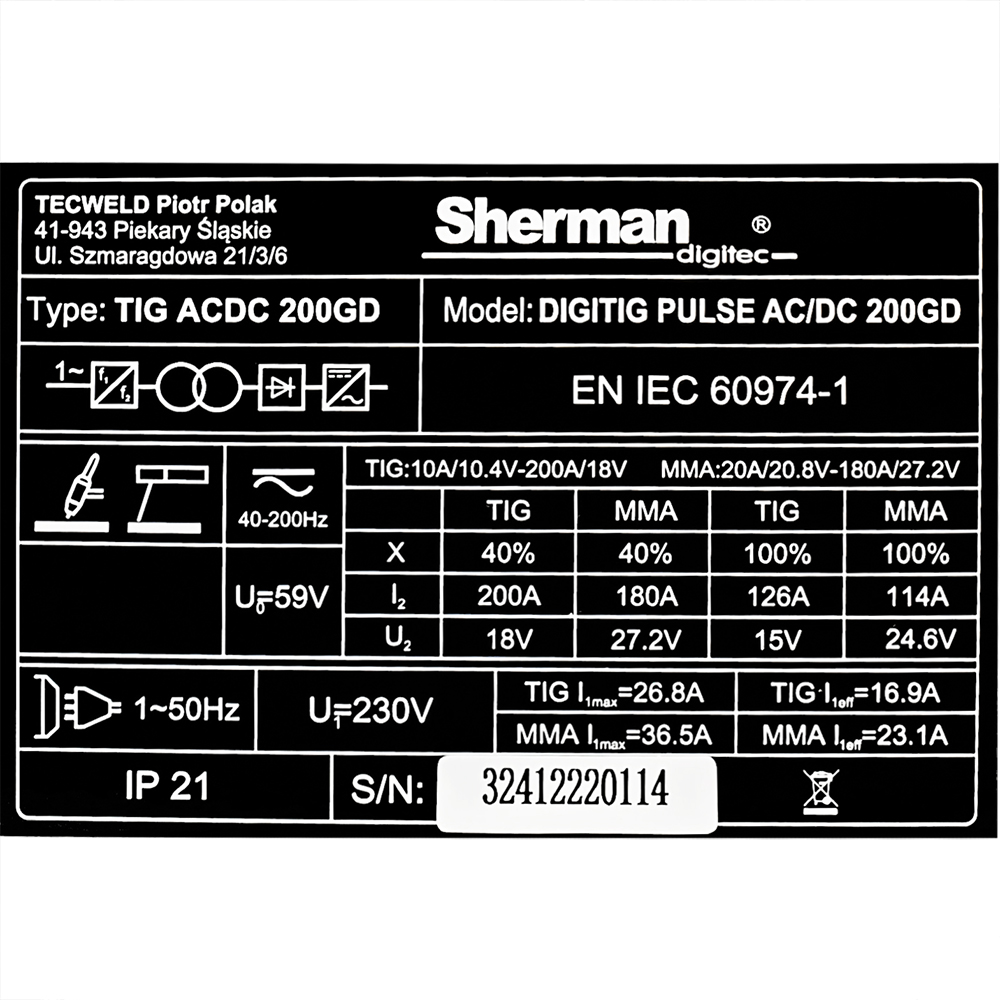 | Funkcje | 2T/4T, Arc Force, Funkcja czyszczenia elektrody, Hot Start, Narastanie prądu, Opadanie prądu, Pamięć ustawień, Powypływ gazu TIG, Przedwypływ gazu, Puls TIG, Sterowanie cyfrowe, VRD, Wyświetlacz LED |