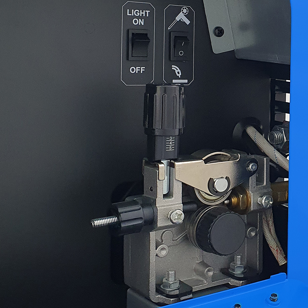 Spawarka wyposażona jest w unikatowy uchwyt MIG z pokrętłem w rękojeści umożliwiającym zdalną regulację napięcia/prądu spawania podczas pracy w trybie synergicznym.