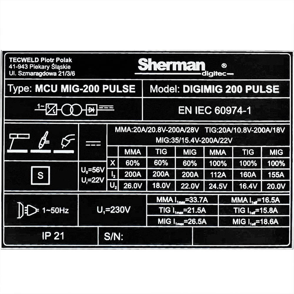 | Max pobór prądu TIG [A] | 21,5 |